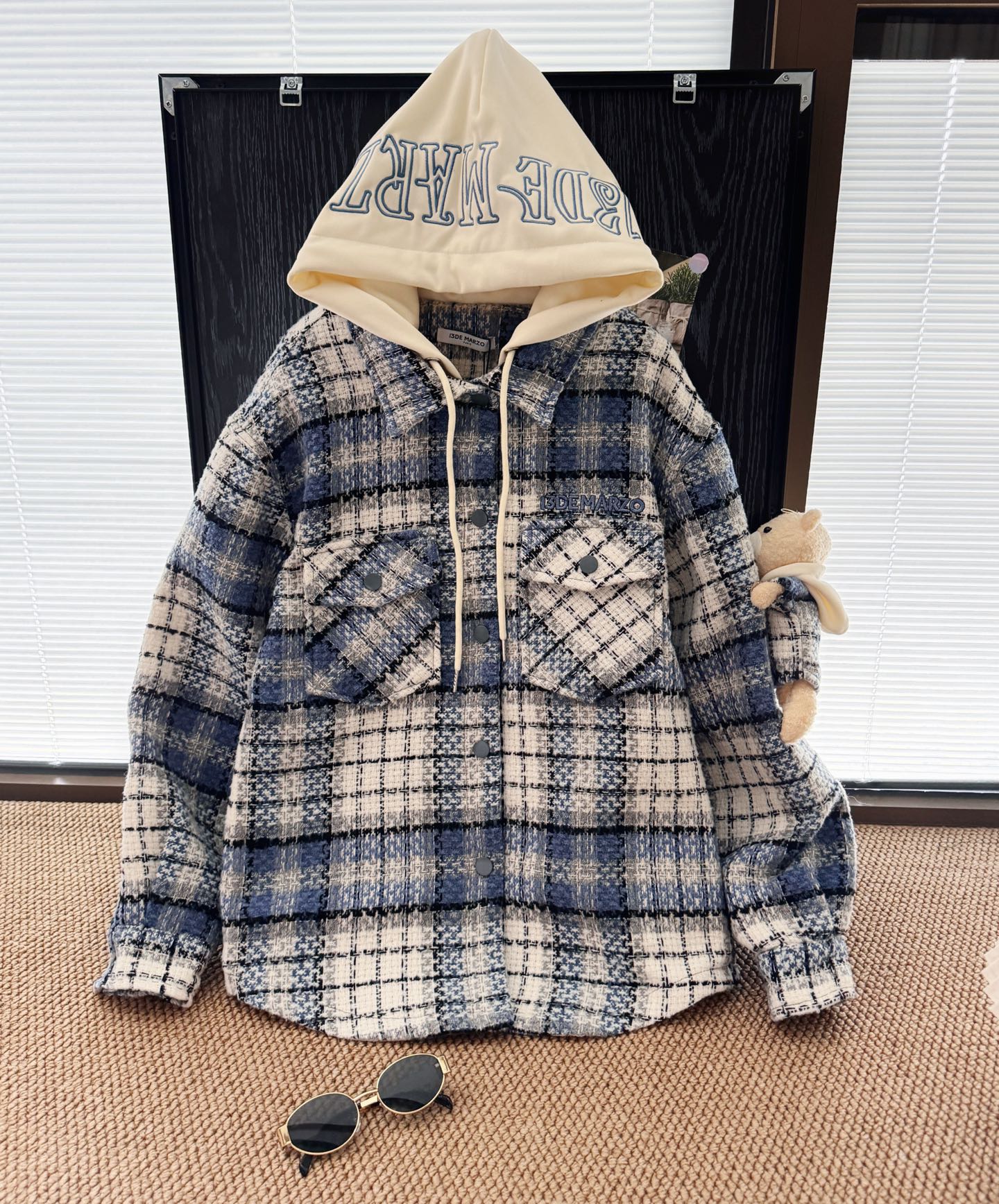 13DE MARZO 抱臂小熊假兩件連帽花呢棉服外套