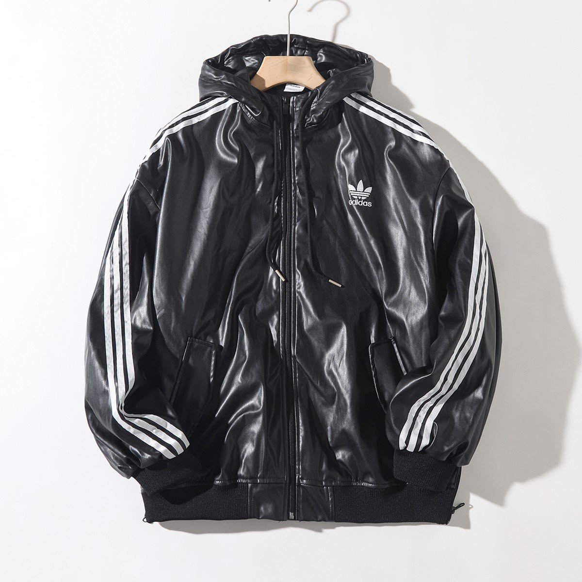 Adidas 復古刺繡logo連帽拉鍊皮衣外套