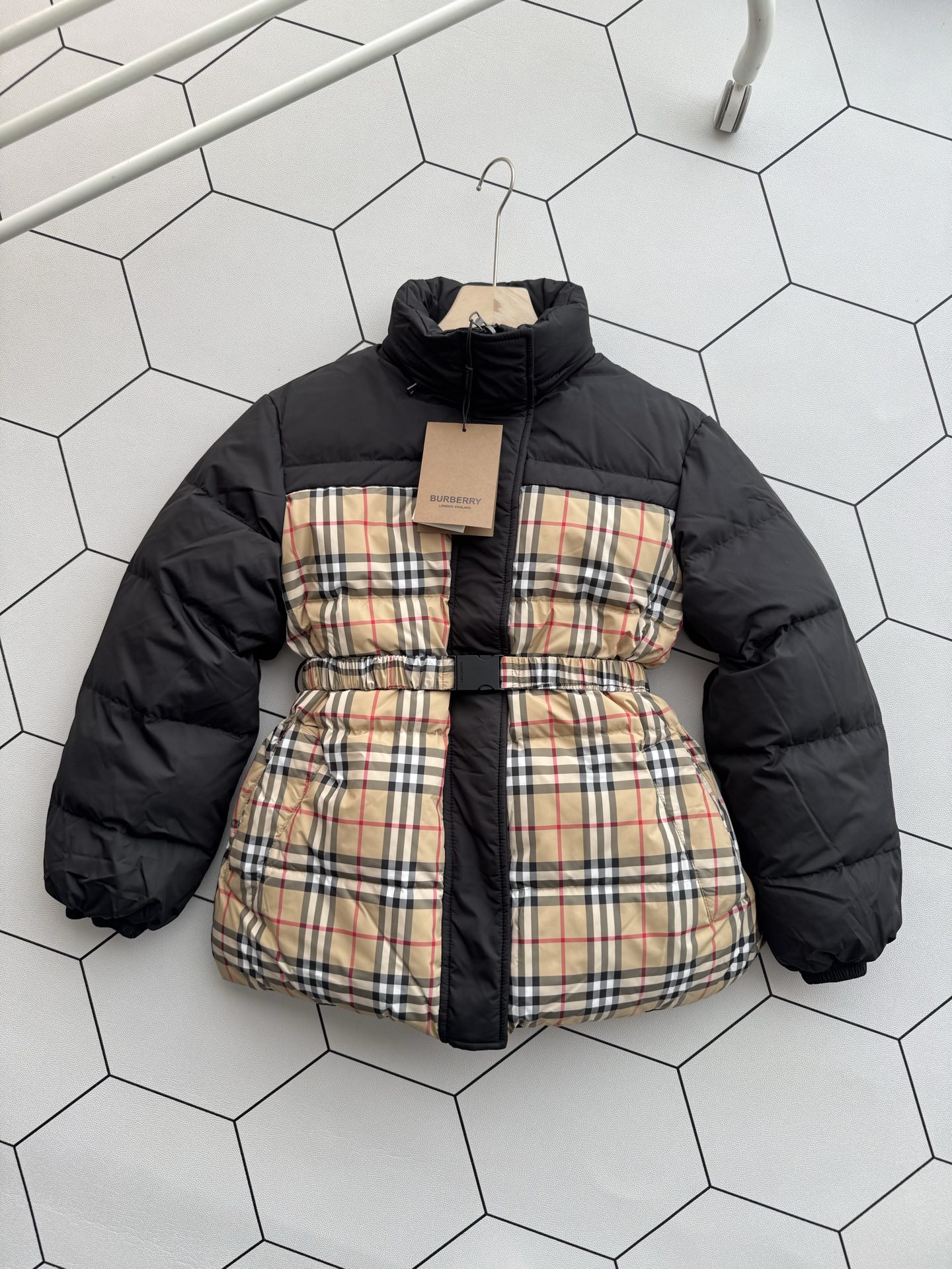 Burberry 經典格紋拼接雙面穿系腰帶羽絨服