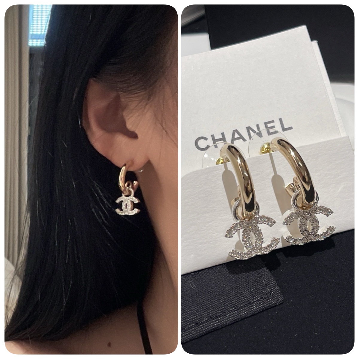 這款耳環結合了淺金耳勾與銀色CC水鑽,,完美展現個性與優雅,成為造型中的亮點