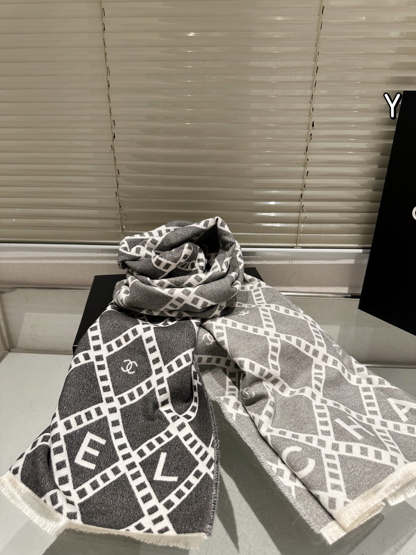 CHANEL 黑白灰漸變菱格紋頸巾🎨 黑白灰漸變菱格紋,經典而時尚 🌟🧣 可作為頸巾、圍巾或披肩使用 😊🐑 羊毛真絲混合材質,手感柔軟且富有質感 💖📐size (cm) : 175 x 70 🌸材質:95%羊毛+5%真絲