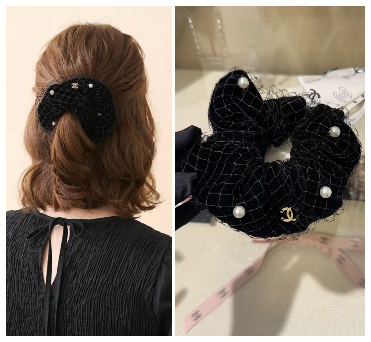 🧵黑絲絨與網紗結合,觸感柔軟🕸️細膩,輕盈耐用;小珍珠✨點綴增添光澤,淺金色CC徽標精緻閃耀🕸️