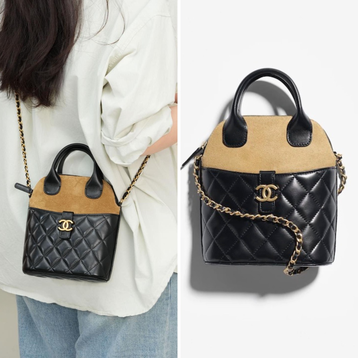 🎨 包款採用棕色麂皮與 亮面小羊皮拼接而成,兩種材質形成了啞光與亮面之間的反差,展現獨特的層次感與時髦氛圍 👜