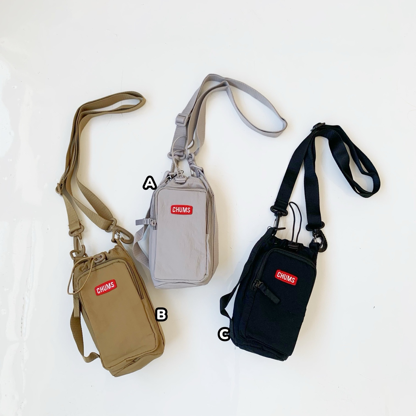 CHUMS 洽洽鳥斜挎小袋🔄 配有可拆取可調節肩帶,提供多種攜帶方式 😊🎨 經典顏色,容易搭配各種服飾風格 🌟📏 適中尺寸,輕巧便攜 💖🌈 顏色:A 灰色B 卡其C 黑色📐size (cm) :20✖️15