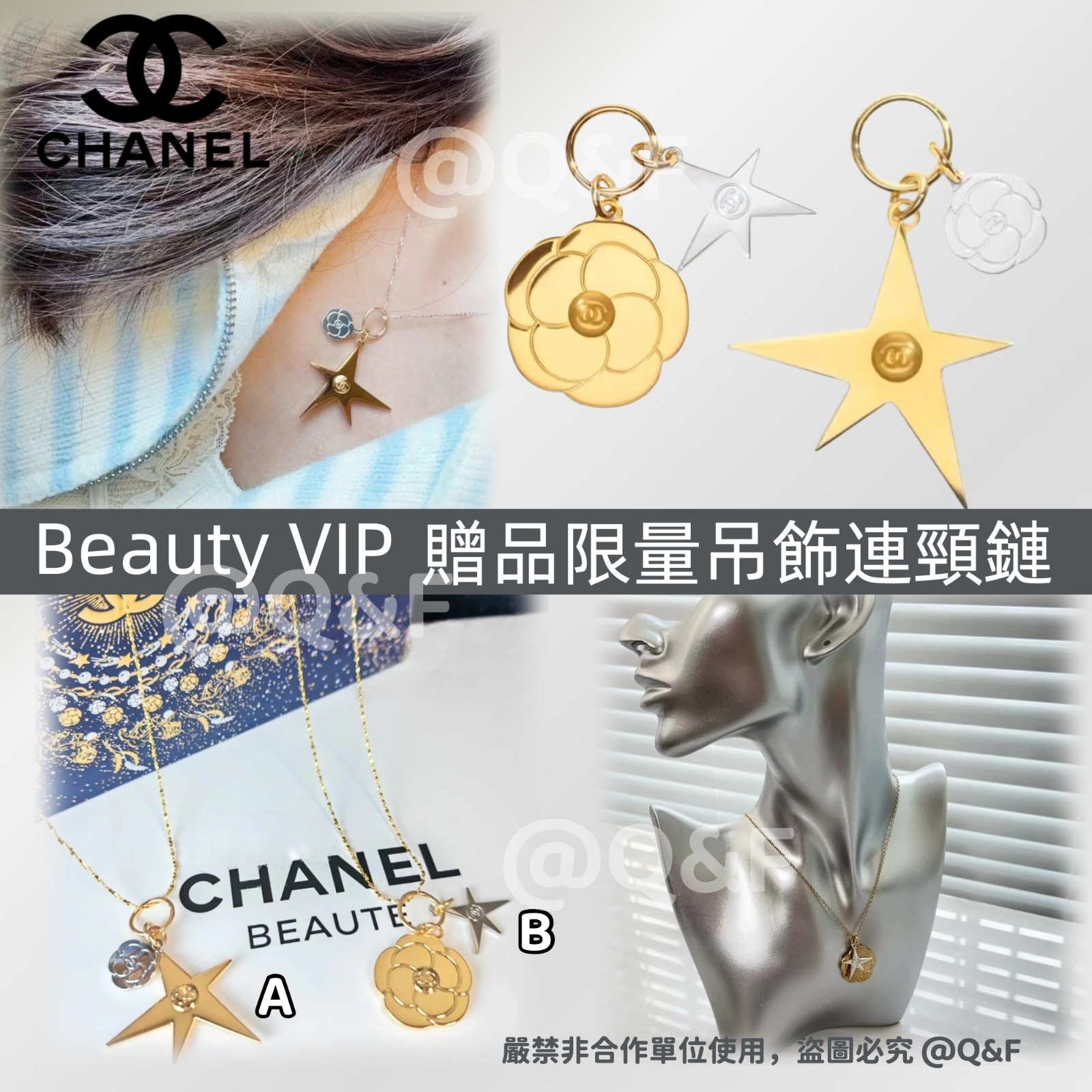 Chanel Beauty VIP GIFT 贈品限量吊飾改裝頸鏈 連禮盒SIMPEE C 已經幫各位配咗頸鏈🙋♀️保證每個鎖扣,必定有頸鏈跟👏👏🫶每套包括:🫶CHANEL 黑色索袋🫶金色頸鏈🫶吊飾🅰️. 五角星款🅱️. 山荼花款