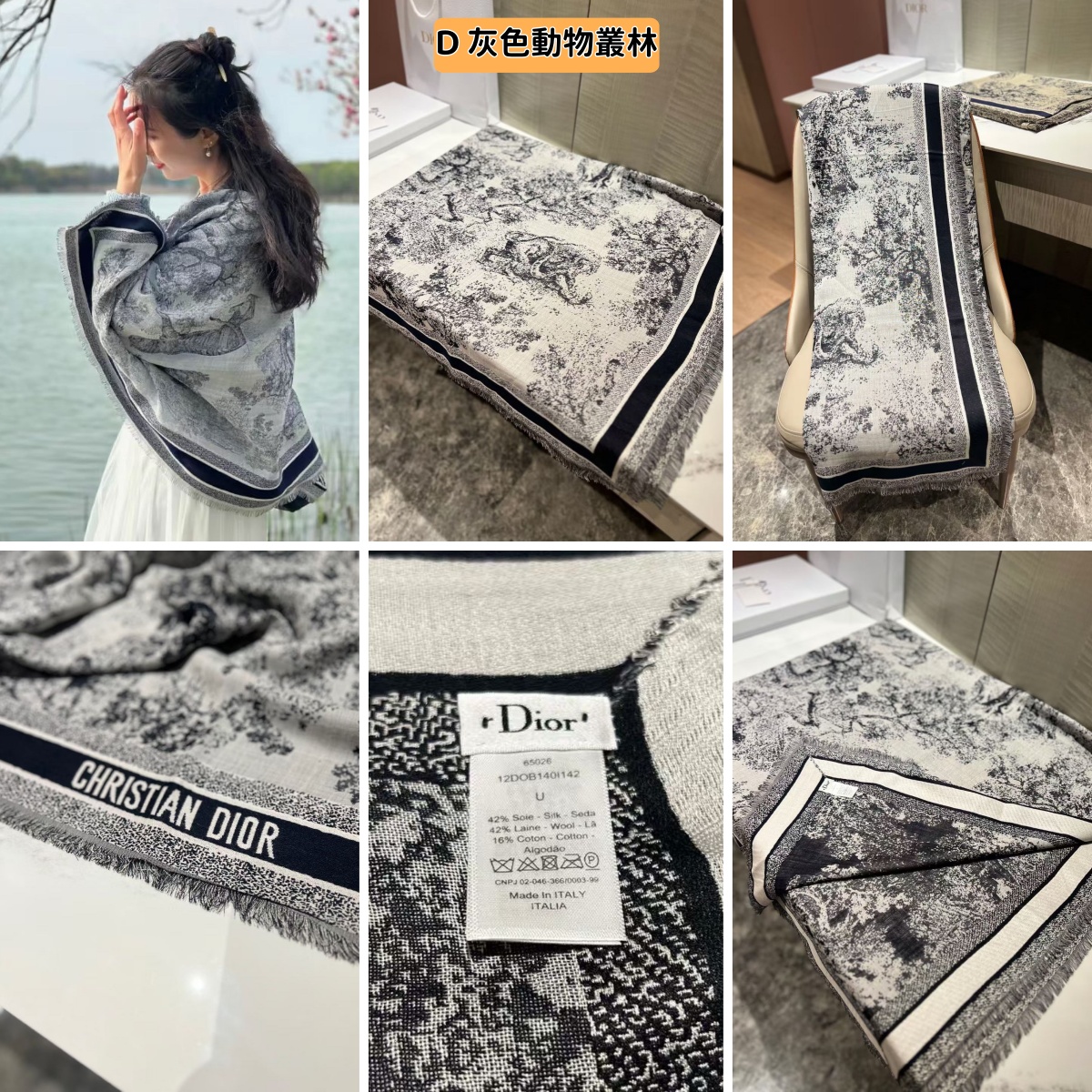 而動物叢林圍巾則以經典 Toile de Jouy 主題圖案為主題,綴以對比色 Christian Dior 標誌緹花飾帶,無論是當作披肩還是頸巾都優雅百搭👏