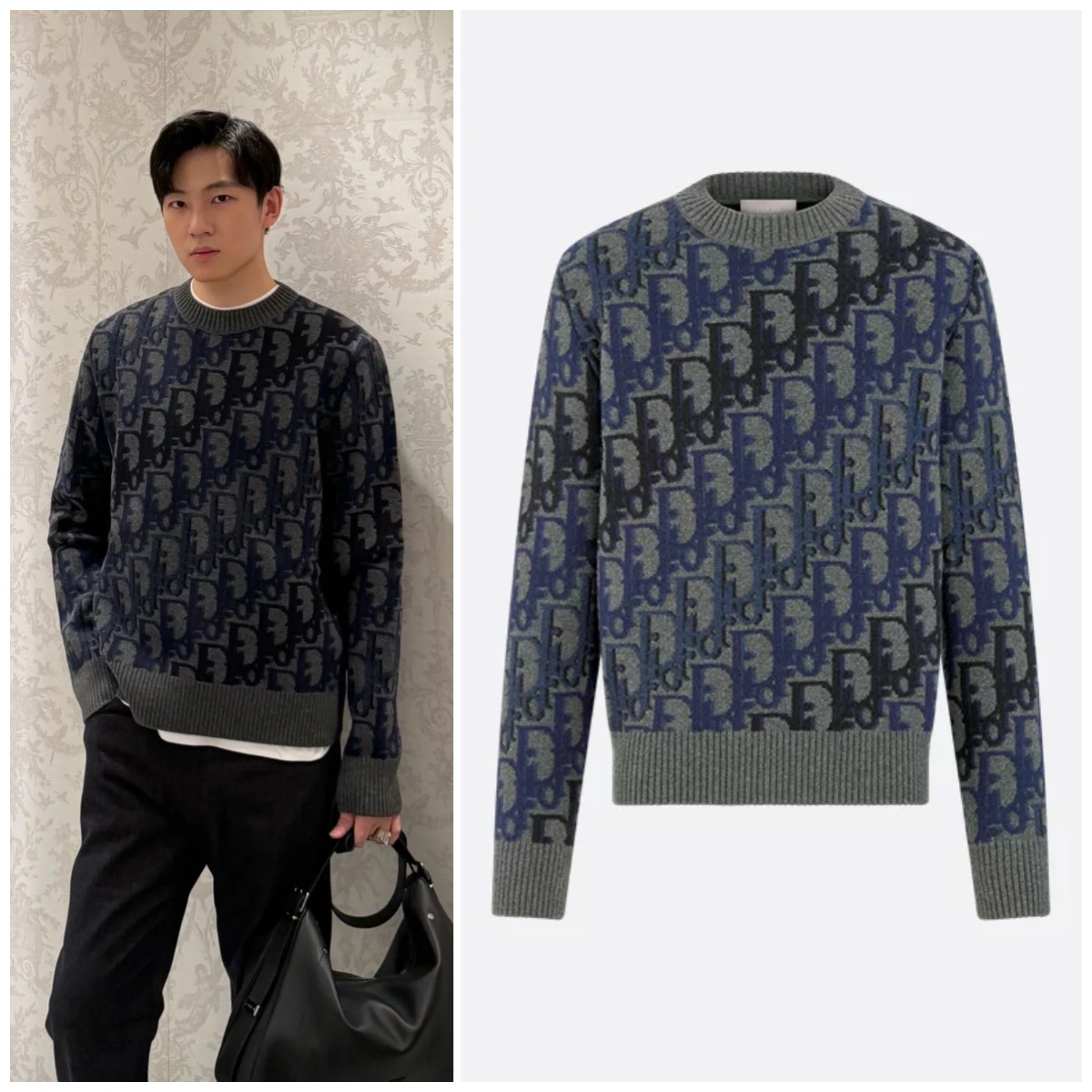 經典 Dior Oblique 主題圖案。以灰色羊毛緹花製成,配以多色全幅 Dior Oblique 圖案,設有稜紋圓領、袖口及下擺。此毛衣飾有全幅主題圖案,繽紛色彩和鮮明圖案為造型增添特色。