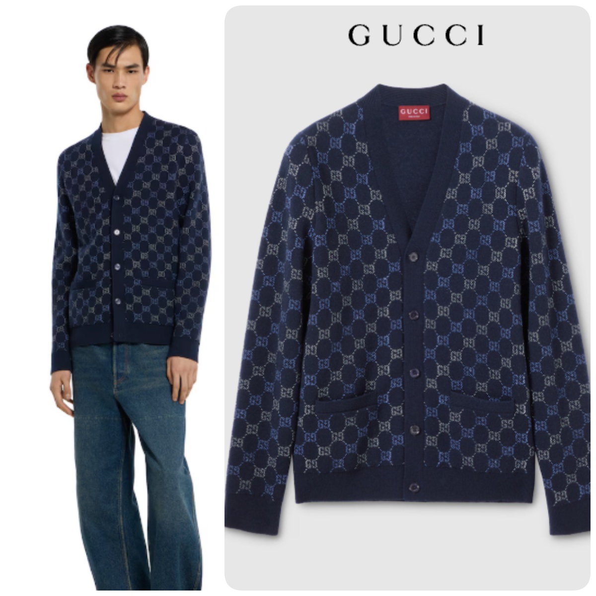 該系列產品運用了多種紡織工藝,巧妙地詮釋了標誌性的GG圖案,呈現出豐富的視覺效果。這款V領毛衣採用GG雙面羊毛針織而成