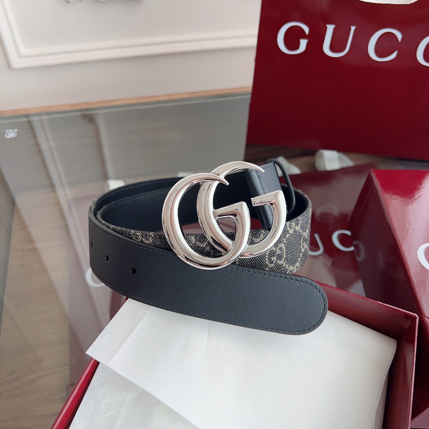 透過現代視角重新詮釋品牌經典元素 ✨以標誌性 GG 搭扣點綴,結合拼接牛皮革,細節中展現高級質感👏黑色 GG Supreme 帆布搭配背面黑色牛皮革設計 🖤低調卻極具辨識度👀4cm 寬度比例俐落 ⚖️無論正裝或休閒造型,都能為整體穿搭注入洗練時尚氣息 👖✨