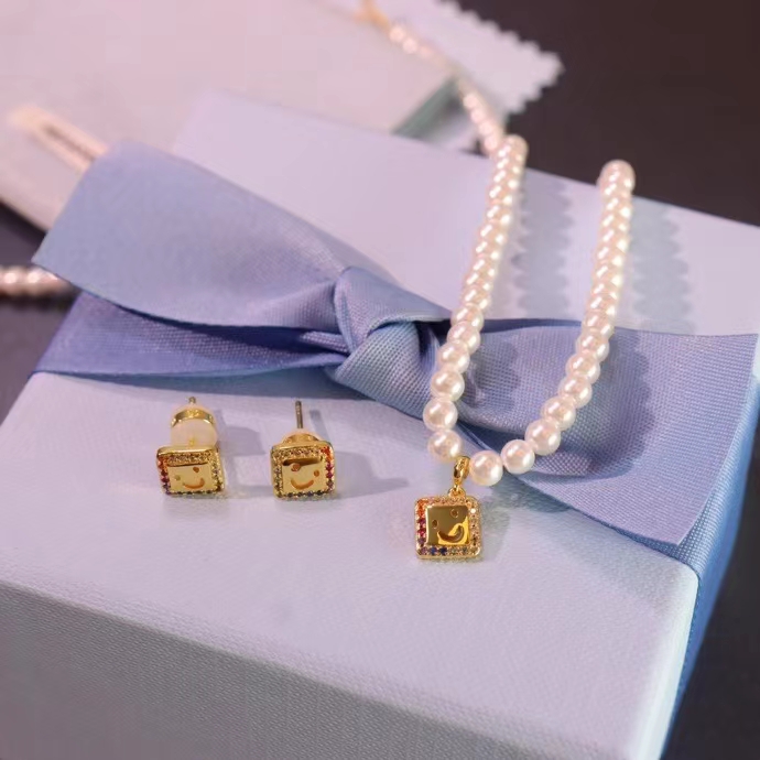 HEFANG 彩鑽笑臉珍珠項鍊/耳環