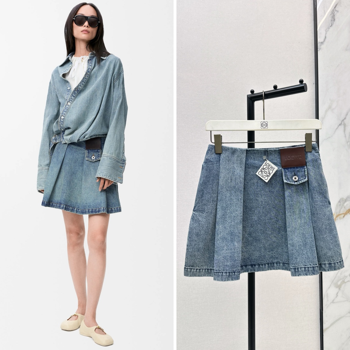 LOEWE Mini Skirt In Denim 皮標压褶牛仔半身裙