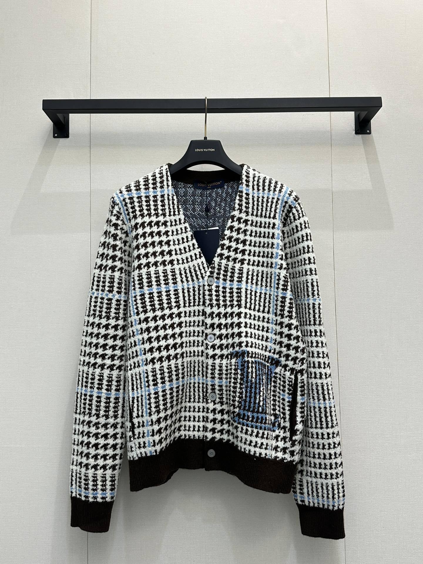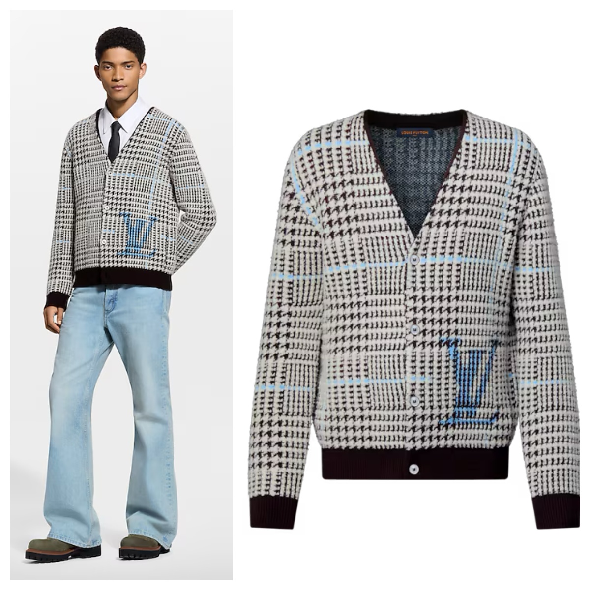 這款時尚的V領開襟外套將傳統英倫西裝剪裁圖案巧妙融入幾何針織設計之中。溫暖的霧面羊毛飾以Cream色及棕色特LV Glen Plaid提花圖案,並點綴淡藍色細節。底部左側綴以大型藍色嵌花LV標誌,而深色羅紋袖口及腰身則為整體造型添上時尚氣息。