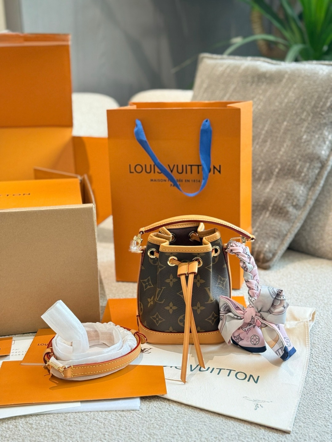 LV 迷你束口水桶包 送絲帶👜 外觀小巧可愛,熱門款 😊🎨 立體包型,提升了視覺效果與耐用性 🌟🔄 抽拉收口,增添了一份靈活性 💖🔗 可拆取手柄與肩帶,可靈活選擇多種攜帶方式 ✨📐size (cm) : 13 x 16 x 10