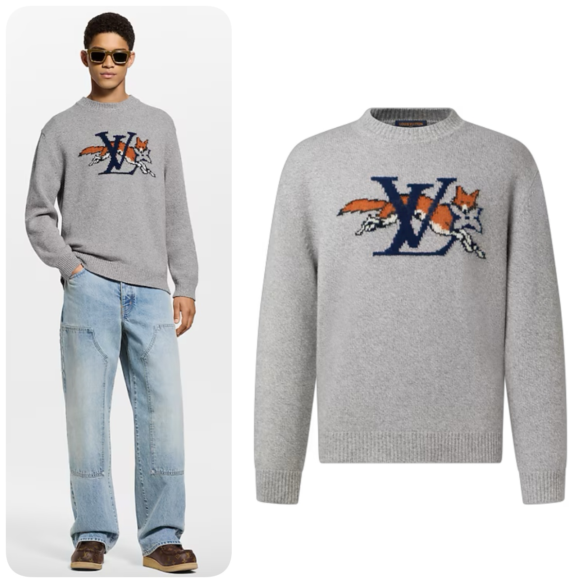 上衣綴以玩味十足的嵌花圖案,取材自英式鄉郊風格,呈現特大LV標誌,銜著Monogram花卉圖案的狐狸躍動其間。上衣以淡灰色羊毛及山羊絨混紡紗線編織而成,背面綴以VVN色皮革Marque L.Vuitton Déposée貼章,是今季溫暖舒適的必備單品。