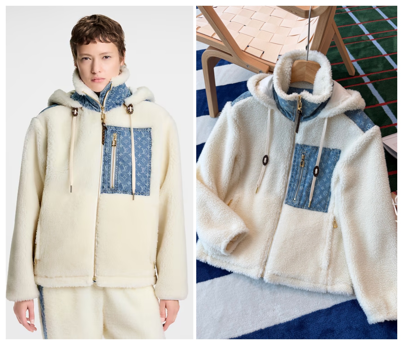 ☁️ 這款舒適的抓絨外套採用蓬鬆的羊毛🐑 混紡面料製成,是冬季❄️ 的理想之選。 胸袋、高領和肩部飾以撞色Monogram牛仔👖 布拼接,為品牌標🔠 誌性設計增添一抹清新✨ 氣息。連帽和抽繩🧥 設計帶來額外保暖💨 效果。金色金屬飾件則營造出別緻優雅的氛圍👑