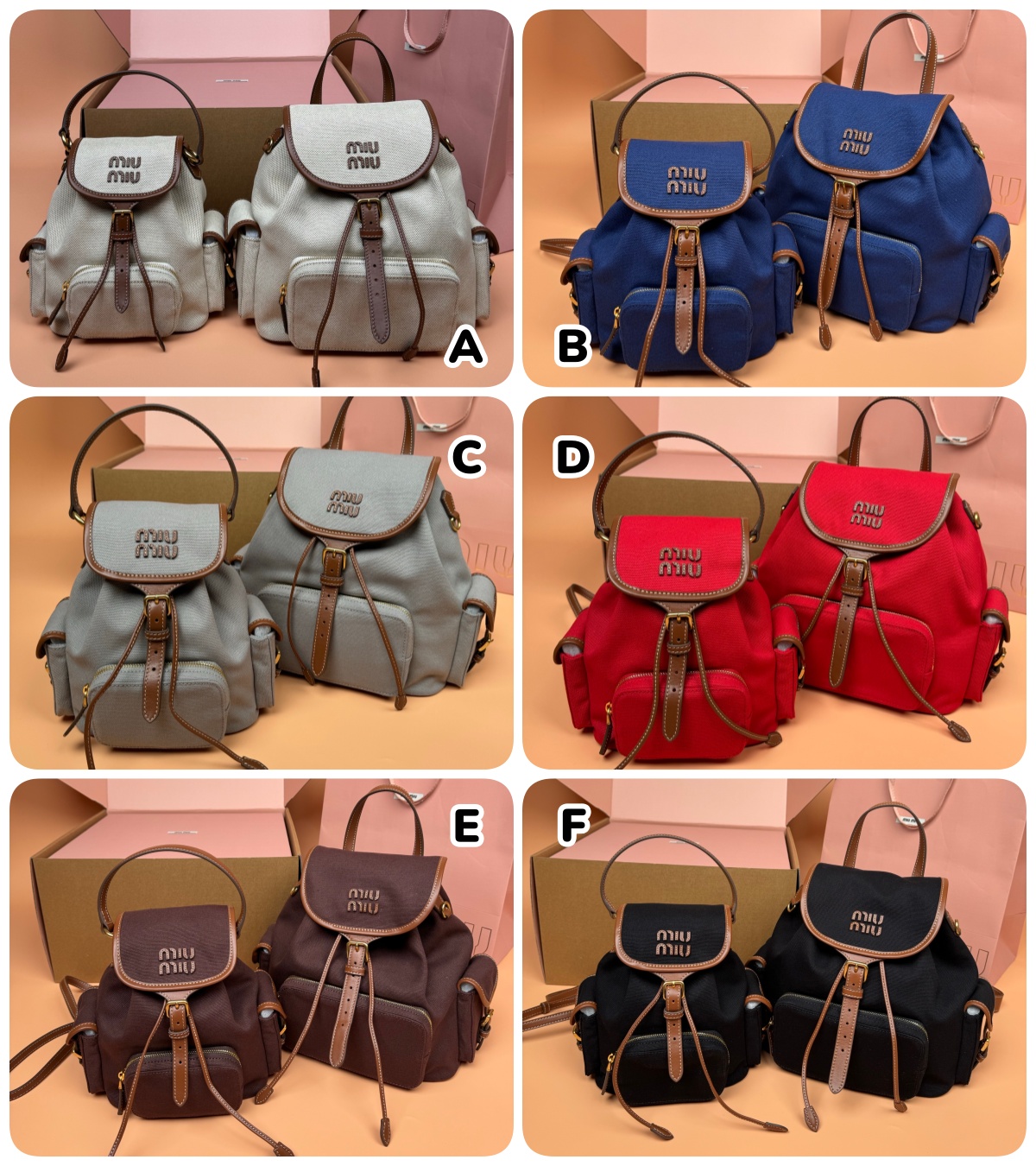 這款帆布皮革背囊的靈感源自學校裝備,讓人回想起童年,並糅合精緻和實用的美感。別具一格的多口袋設計,體現 Miu Miu 手袋的當代玩味精神。