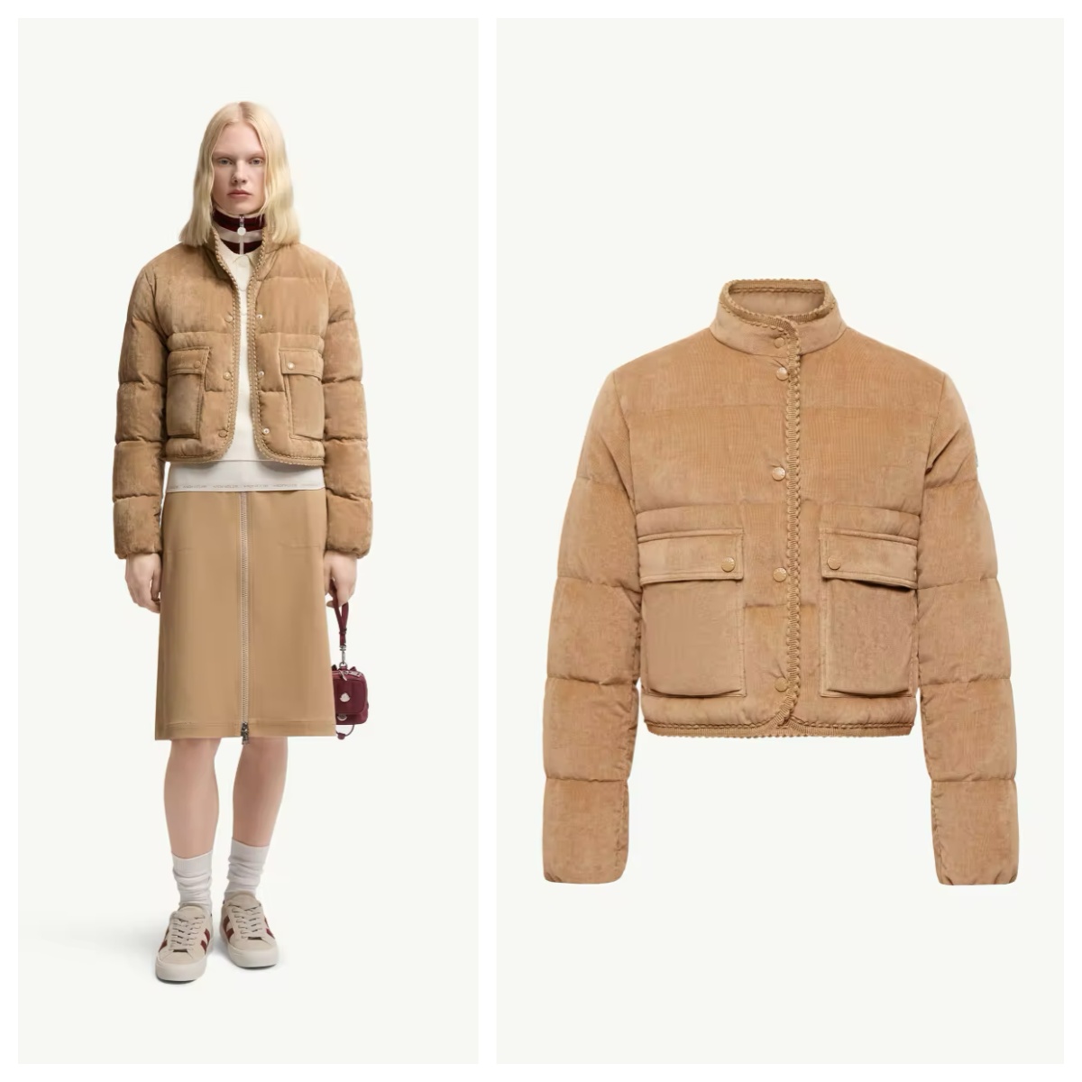 以柔軟的燈芯絨重新演繹經典羽絨服。這款短款羽絨服採用柔美的短款剪裁,並以精緻的編織飾邊點綴。採用經典色調,保暖效果更佳,可輕鬆搭配日常必需品或高級晚禮服。