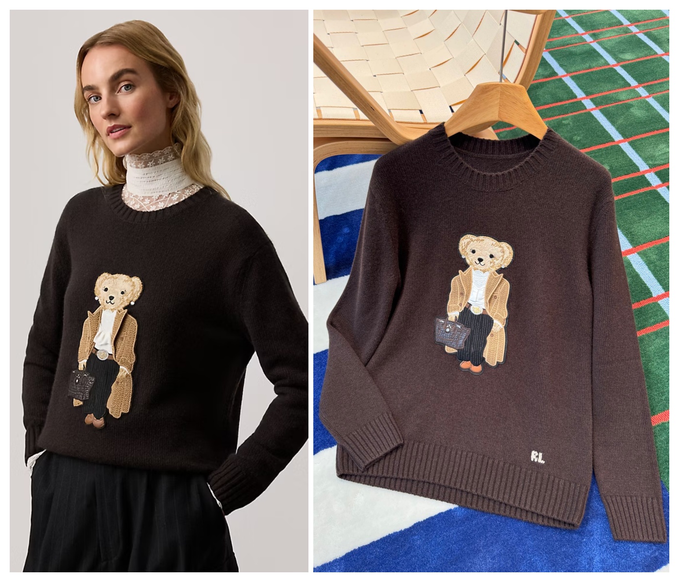 採用 針織🧶混紡紗線 製成,上身觸感 軟糯親膚 🌟 胸前 經典 小熊🐻章仔 成為視覺亮點,重工刺繡🪡細節非常好,🍂秋冬穿著不僅保暖❄️,還能輕鬆打造 氣質又時髦😎 的日常造型。