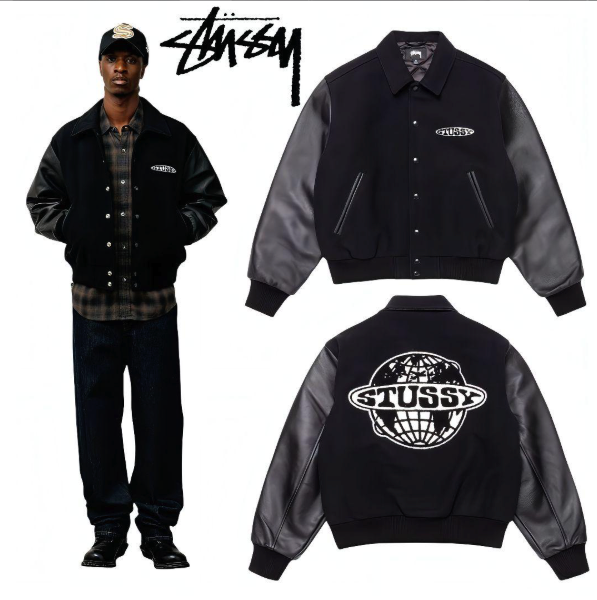 Stussy FW25 GLOBE VARSITY 拼皮袖棒球服外套